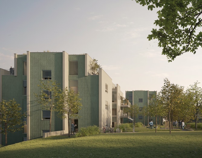 Die Baufelder werden in zwei Etappen realisiert und sind unabhängig voneinander mit je zwei Mehrfamilienhäuser, Zufahrt und Tiefgarage erschlossen.